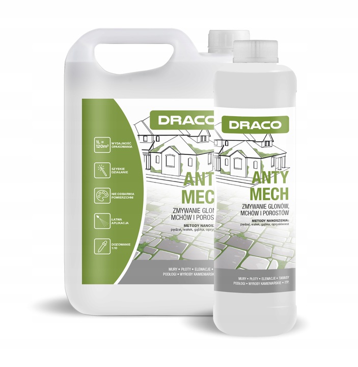 Produkt płynny skoncentrowany do zmywania glonów, mchów i porostów z różnego rodzaju powierzchni (kostki brukowej, dachów, elewacji, płotów, nagrobków).