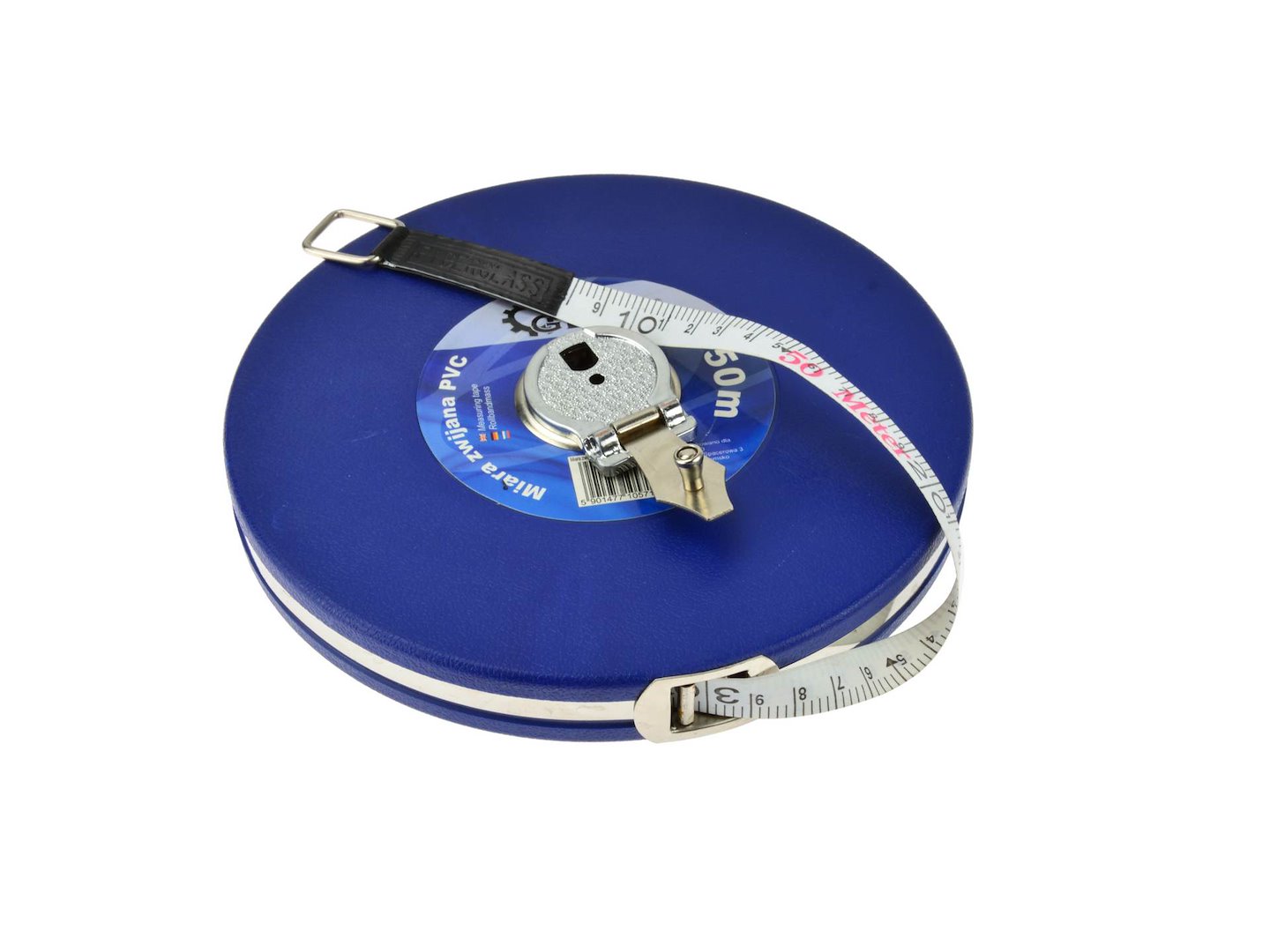 Zwijana taśma miernicza o długości 50m wykonana z wysokiej jakości włókna szklanego.