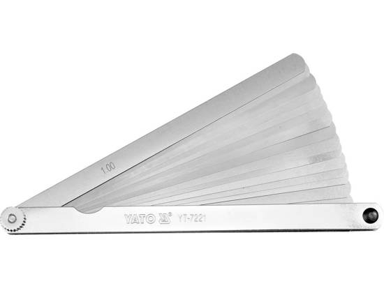 Przeznaczony do precyzyjnego ustawiania szerokości szczelin / np. między stykami elektrycznymi /. Zawiera 17 listków pomiarowych o różnych grubościach, wykonanych z utwardzanej stali sprężynowej. Długość elementu pomiarowego 200 mm , szerokość 12,4 mm. Zawiera następujące wielkości : 0,02/ 0,03/ 0,04/ 0,05/ 0,06/ 0,07/ 0,08/ 0,09/ 0,10/ 0,15/ 0,20/ 0,25/ 0,30/ 0,40/ 0,50/ 0,75/ 1,00 mm. Do precyzyjnych ustawień. Obszary zastosowań - motoryzacja, rzemiosło, przemysł.