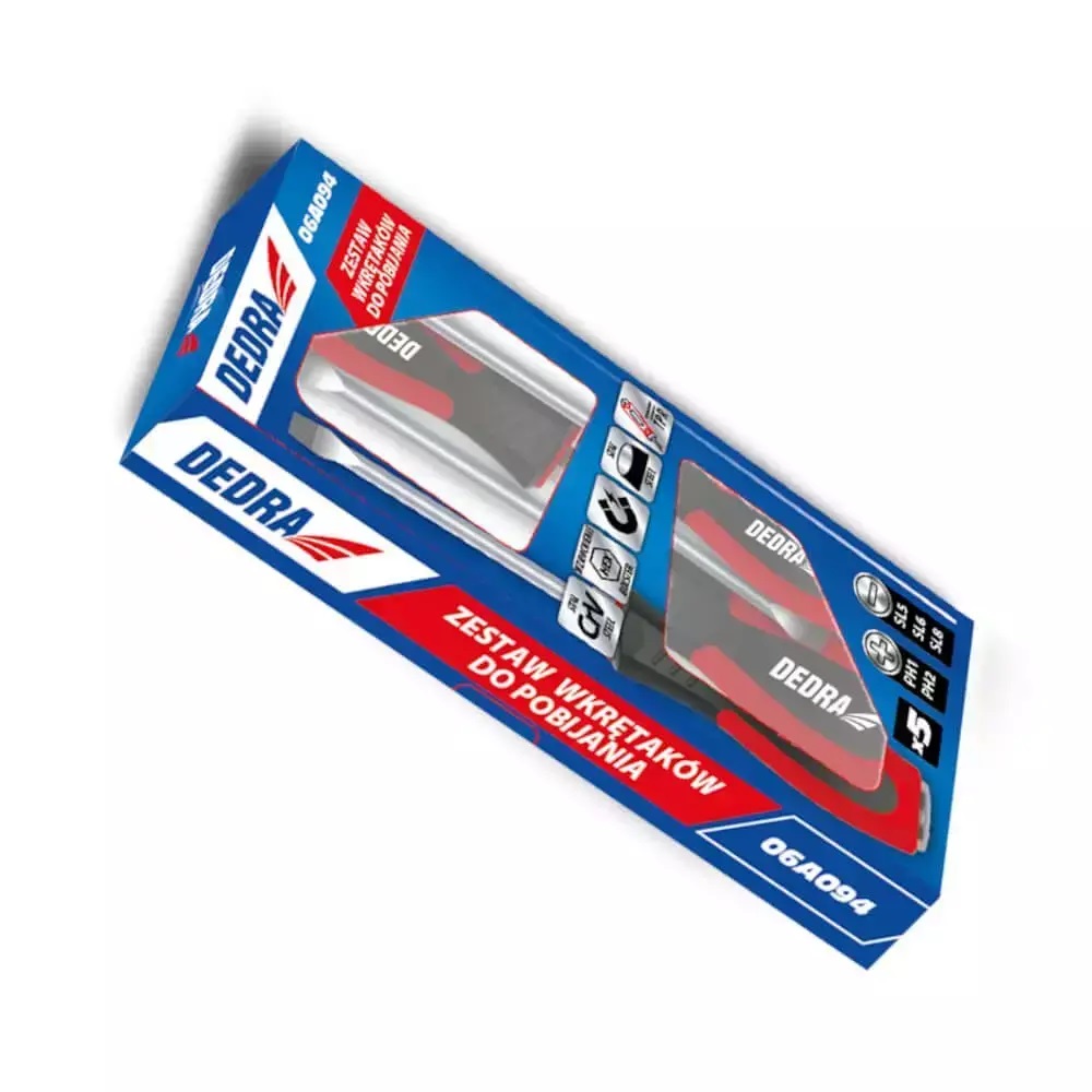 Zestaw 5 wkrętaków do pobijania DEDRA 06A094 to narzędzie, które każdy majsterkowicz powinien posiadać. Wkrętaki do pobijania marki DEDRA wykonane są ze stali CrV, cechującej się dużą wytrzymałością i odpornością na korozję. Wyprofilowana rękojeść wykonana została z połączenia tworzywa sztucznego oraz gumy. Takie połączenie zapewnia użytkownikowi komfort i wygodę podczas wykonywania prac. Magnetyczna końcówka zapewnia precyzję oraz ułatwia pracę wkrętakiem w trudno dostępnych miejscach. Na szczycie rękojeści znajduje się metalowa płaszczyzna przeznaczona do pobijania wkrętaka bez ryzyka zniszczenia rękojeści.