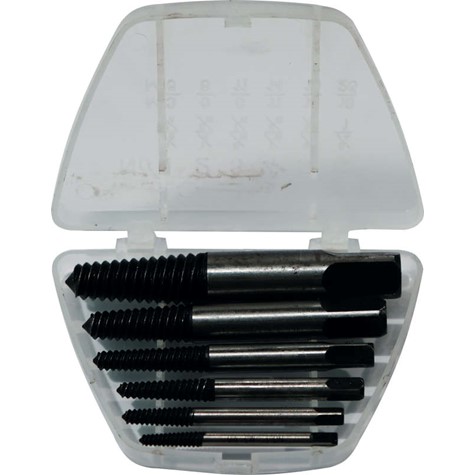 Zestaw wykrętaków stożkowych do zerwanych śrub ze specjalnej stali chromowo-wanadowej w pudełku z tworzywa. Zestaw 6-sztukowy do śrub M3-M24.